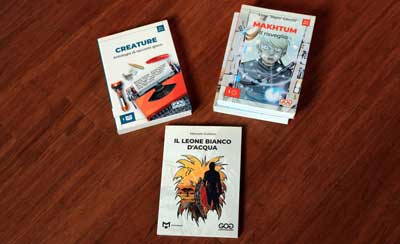 Primo gamebook a cura di Manuele Giuliano pur se lo vediamo vincere il primo premio del concorso Corti in Gioco, con il racconto Ami la piccola viaggiatrice di cui possiamo leggere le gesta nell'antologia Creature, che inaugura una collana definita Mini Mondi. Il leone bianco d'acqua risulta essere un librogame in formato brossurato a colla, con copertina a colori con ali. All'interno troviamo una impaginazione ottima e ad alta fruibilità in bianco e nero che raccoglie illustrazioni a piena pagina e filler art. A livello tipografico tutto ciò che fa azione è in grassetto, così da separare ottimamente il gameplay dalla narrazione.